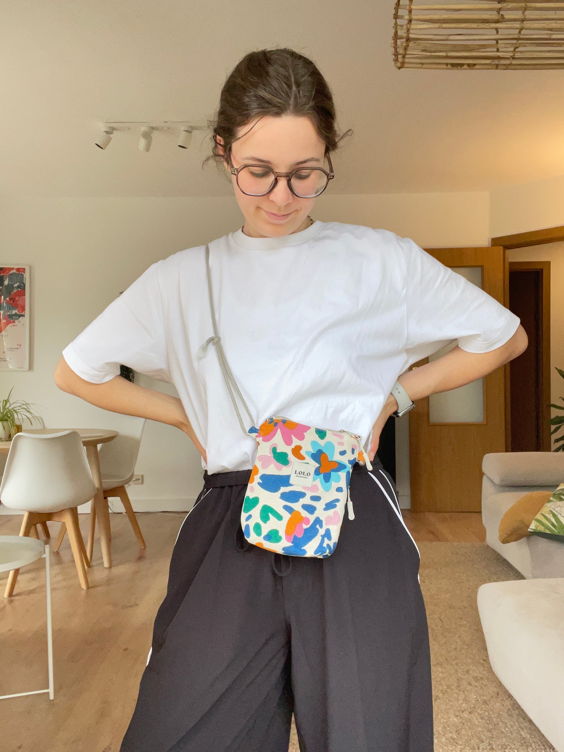 Mini bolsito ideal para llevar lo necesario. Detrás tiene otro bolsillo con cremallera para poder meter las llaves o un monedero.