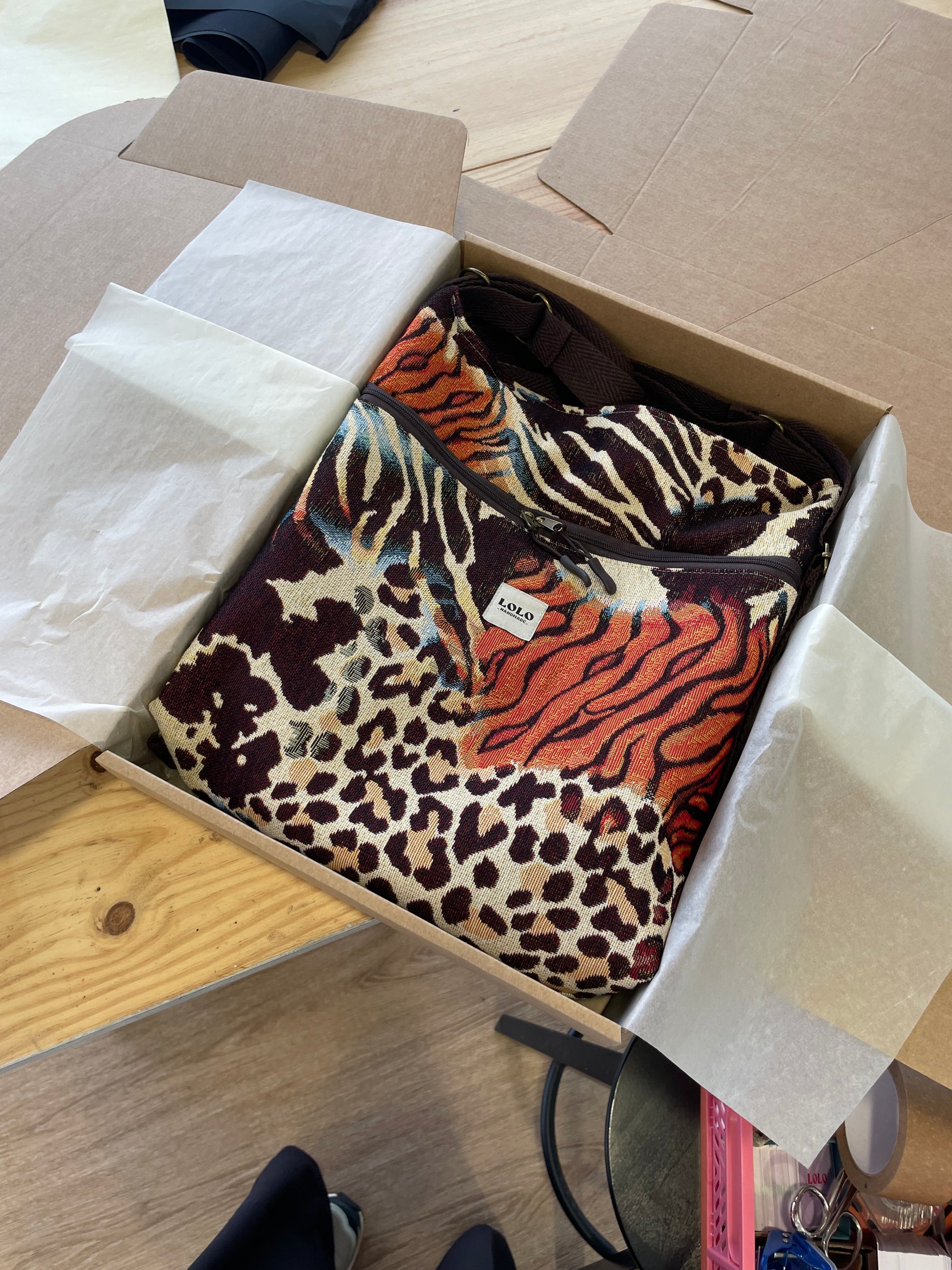 Bolso/mochila negro en animal print. Tiene un bolsillo con cremallera en la parte delantera que va super bien para guardar lo que quieras tener mas a mano.