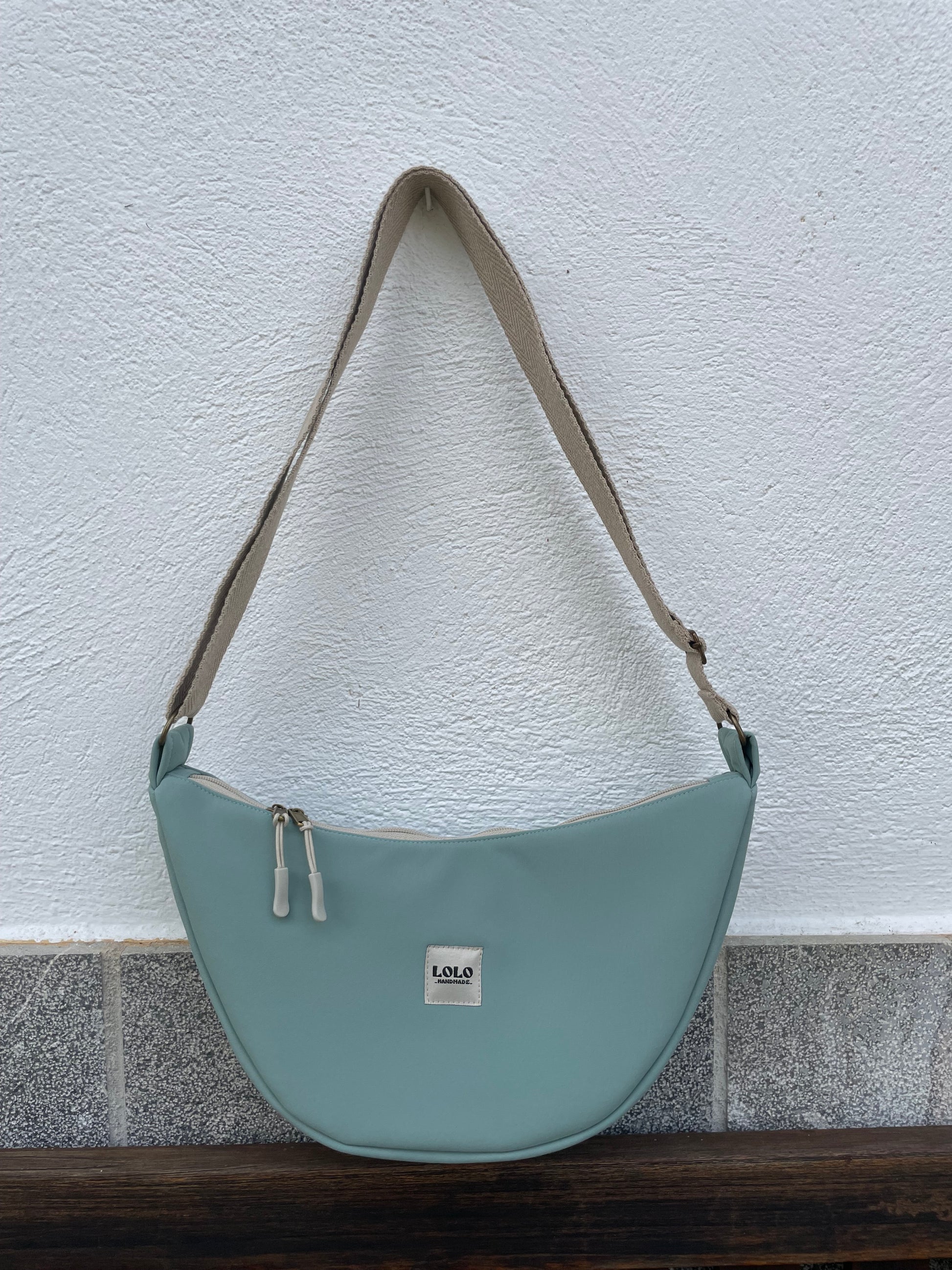 Bolso Moon en color verde menta. El tejido shoftsell es impermeable y muy resistente. Este nuevo diseño de media luna te encantará!