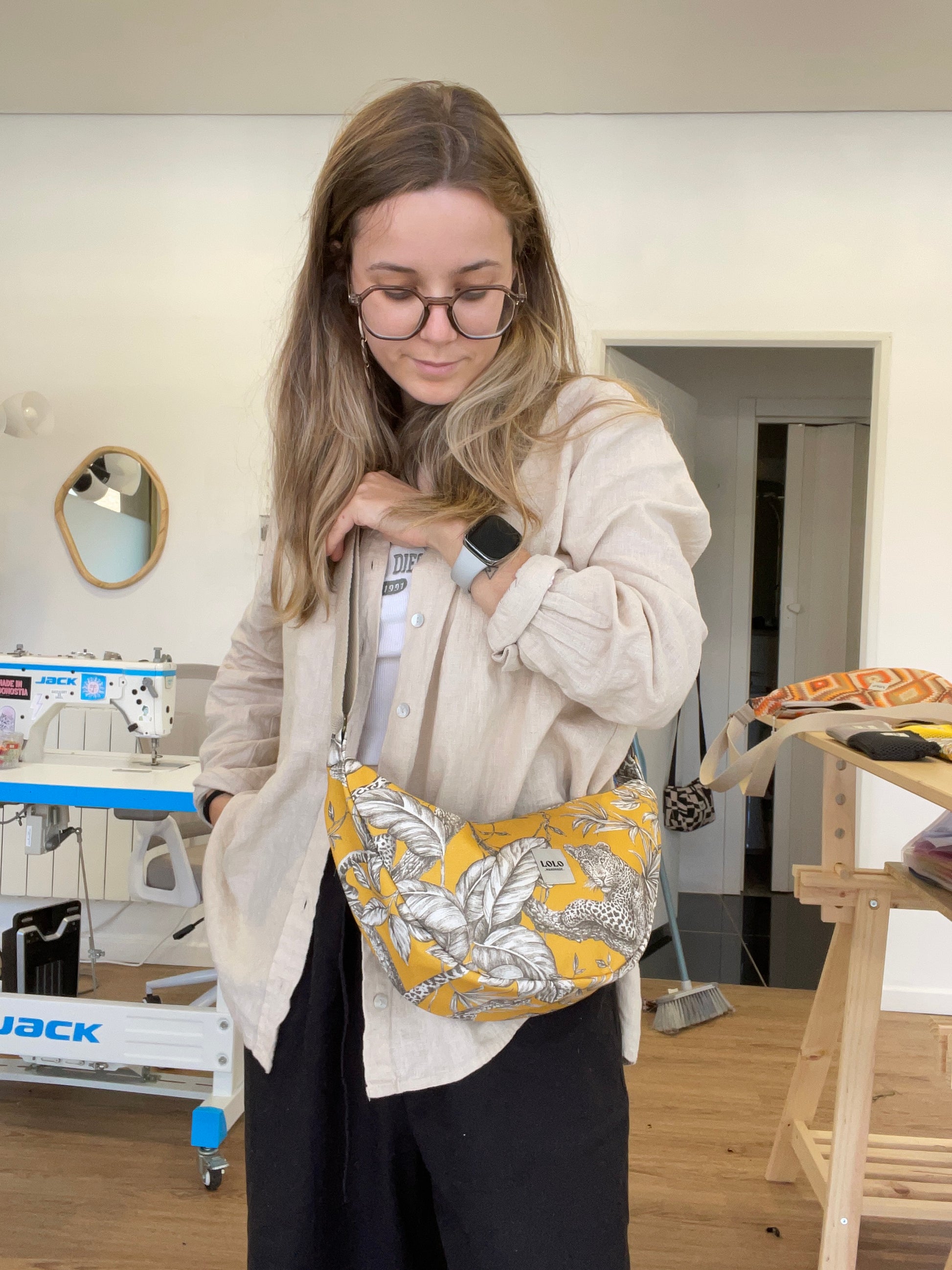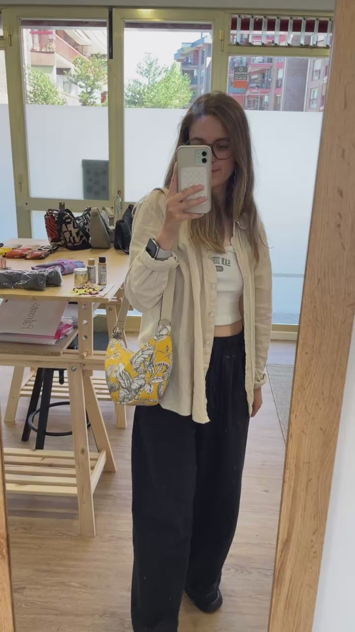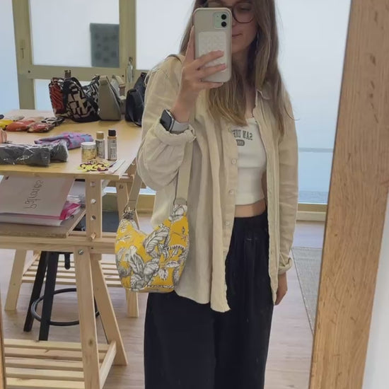 Bolso en color mostaza en estampado de plantas y leopardos. Este nuevo diseño de media luna te encantará!