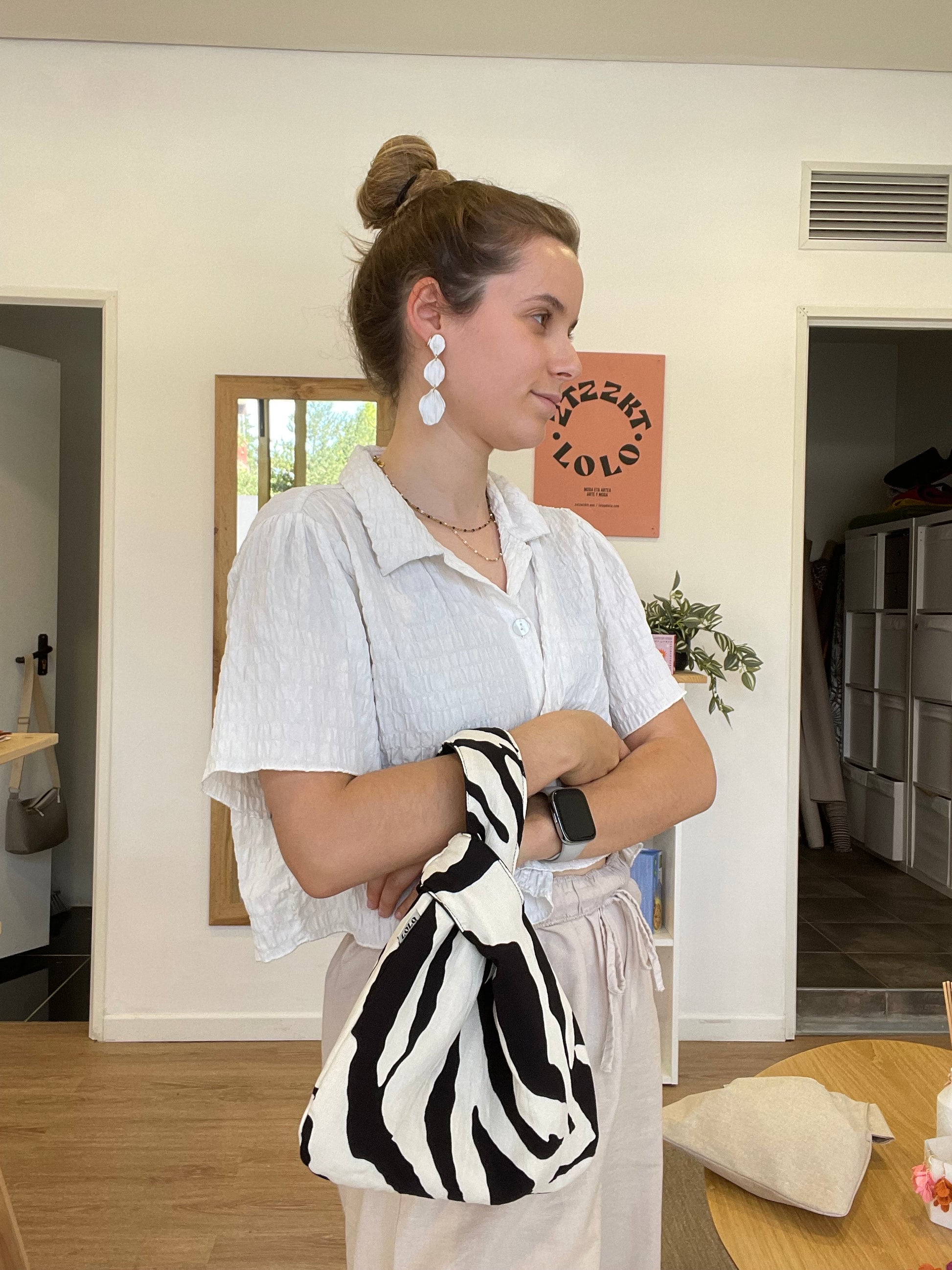 Bolso nudo en estampado de cebra, es un bolso para llevarlo en la mano.