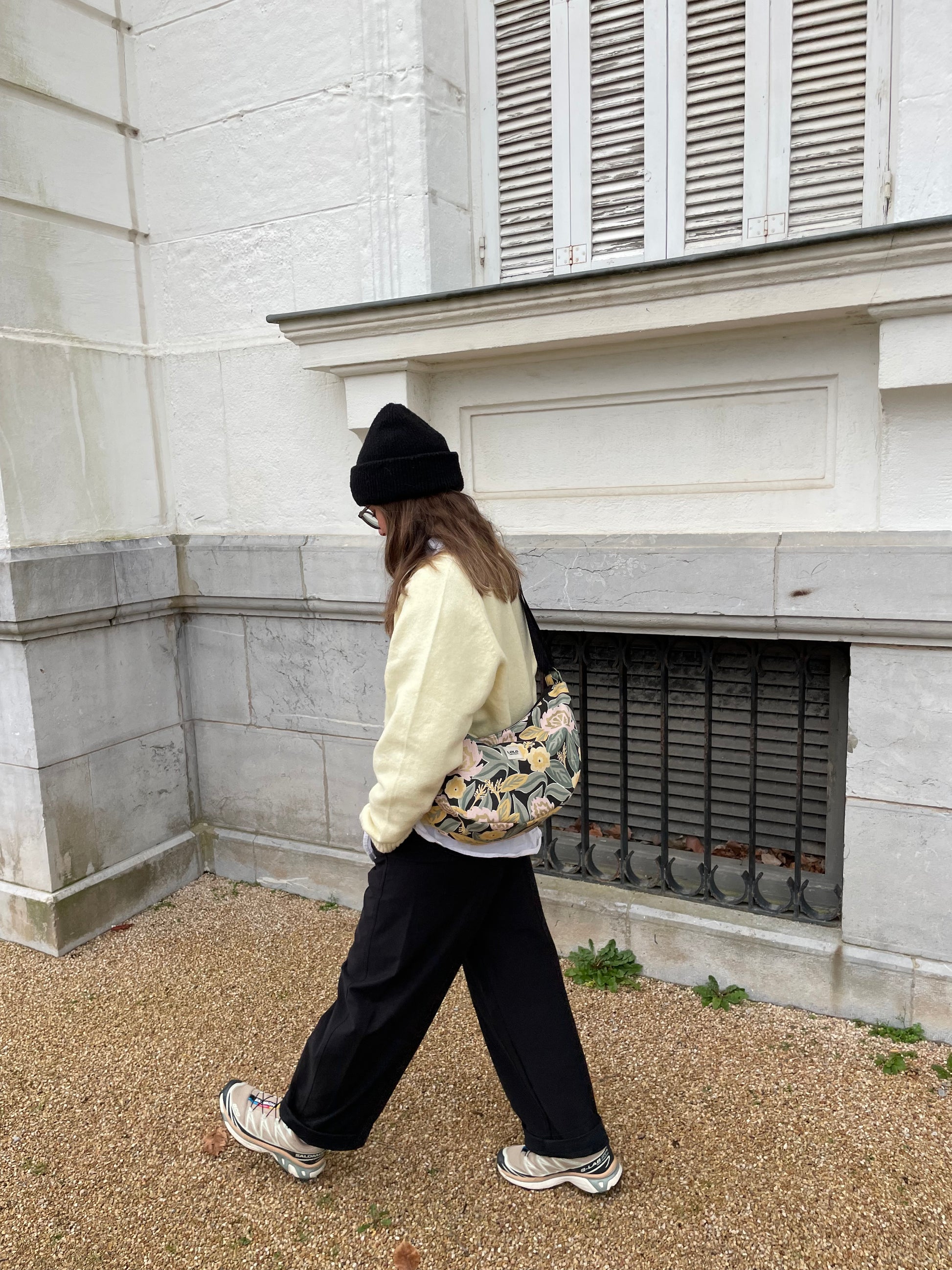 Bolso Moon XL en estampado floral. El tejido es una cretona. Este nuevo diseño de media luna te encantará! Además, es un bolso muy completo y con capacidad, en la parte de atrás del bolso tiene un bolsillo con cremallera muy amplio.