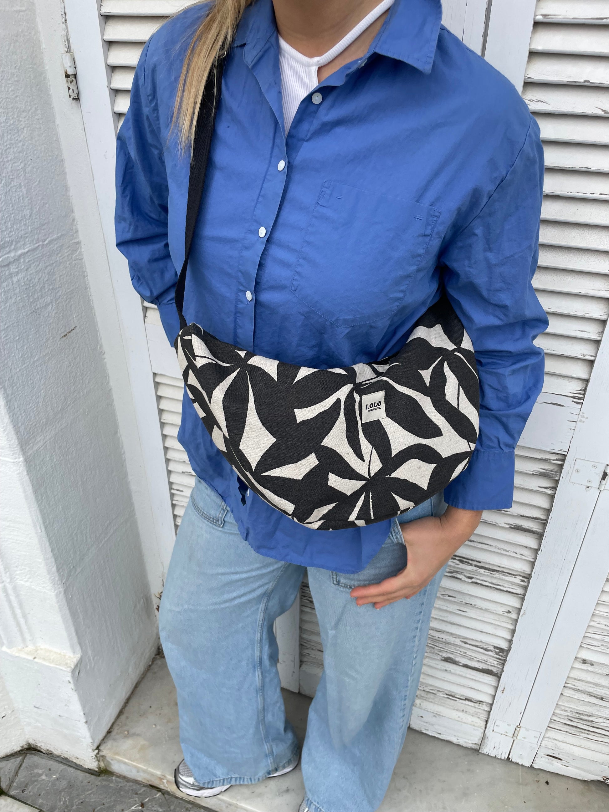 Bolso Moon XL en estampado de hojas. El tejido es una lona de lino y algodón. Este nuevo diseño de media luna te encantará! Además, es un bolso muy completo y con capacidad, en la parte de atrás del bolso tiene un bolsillo con cremallera muy amplio.
