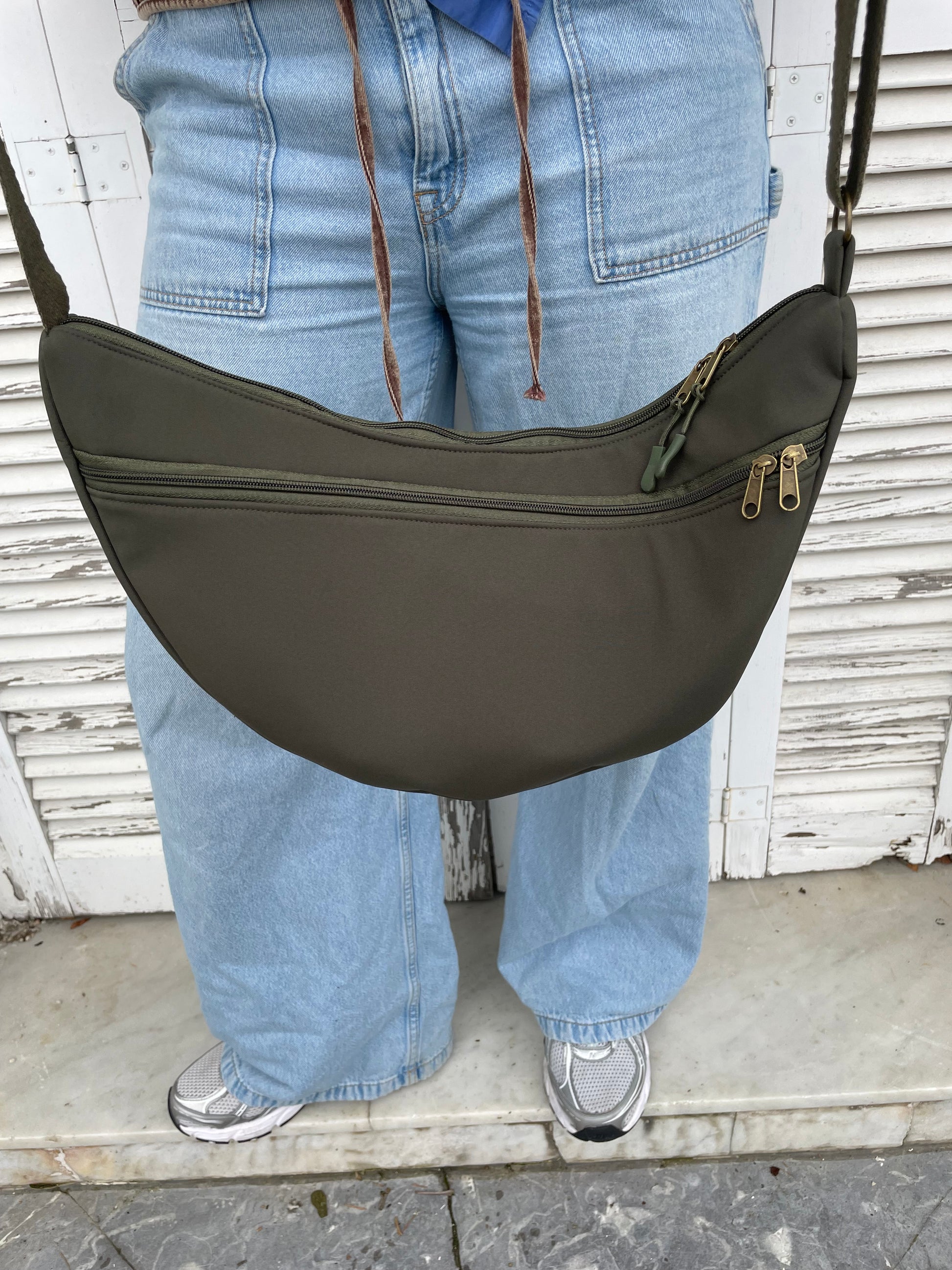 Bolso Moon XL en color verde botella. El tejido softshell es impermeable y muy resistente. Este nuevo diseño de media luna te encantará! Además, es un bolso muy completo y con capacidad, en la parte de atrás del bolso tiene un bolsillo con cremallera muy amplio.