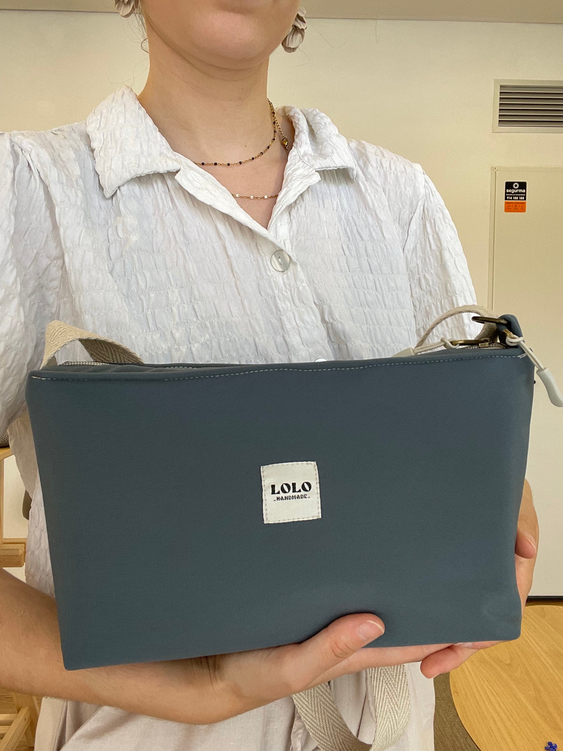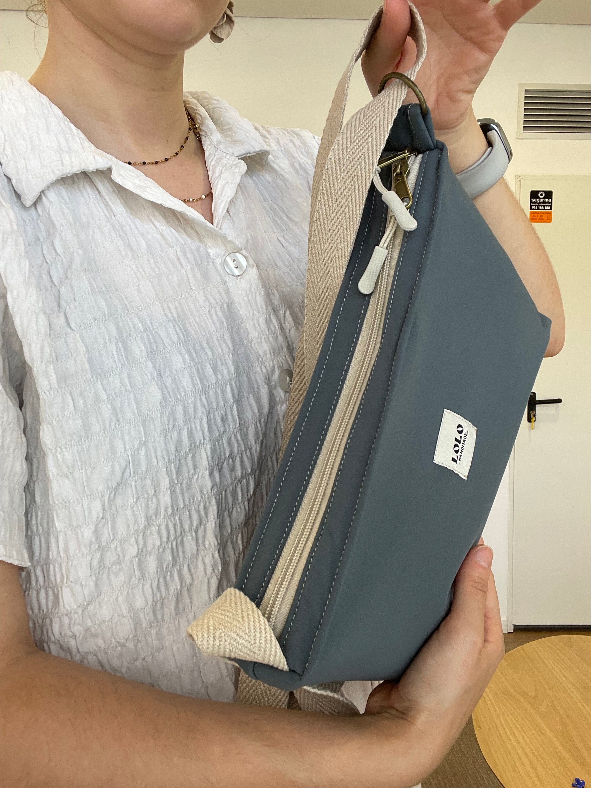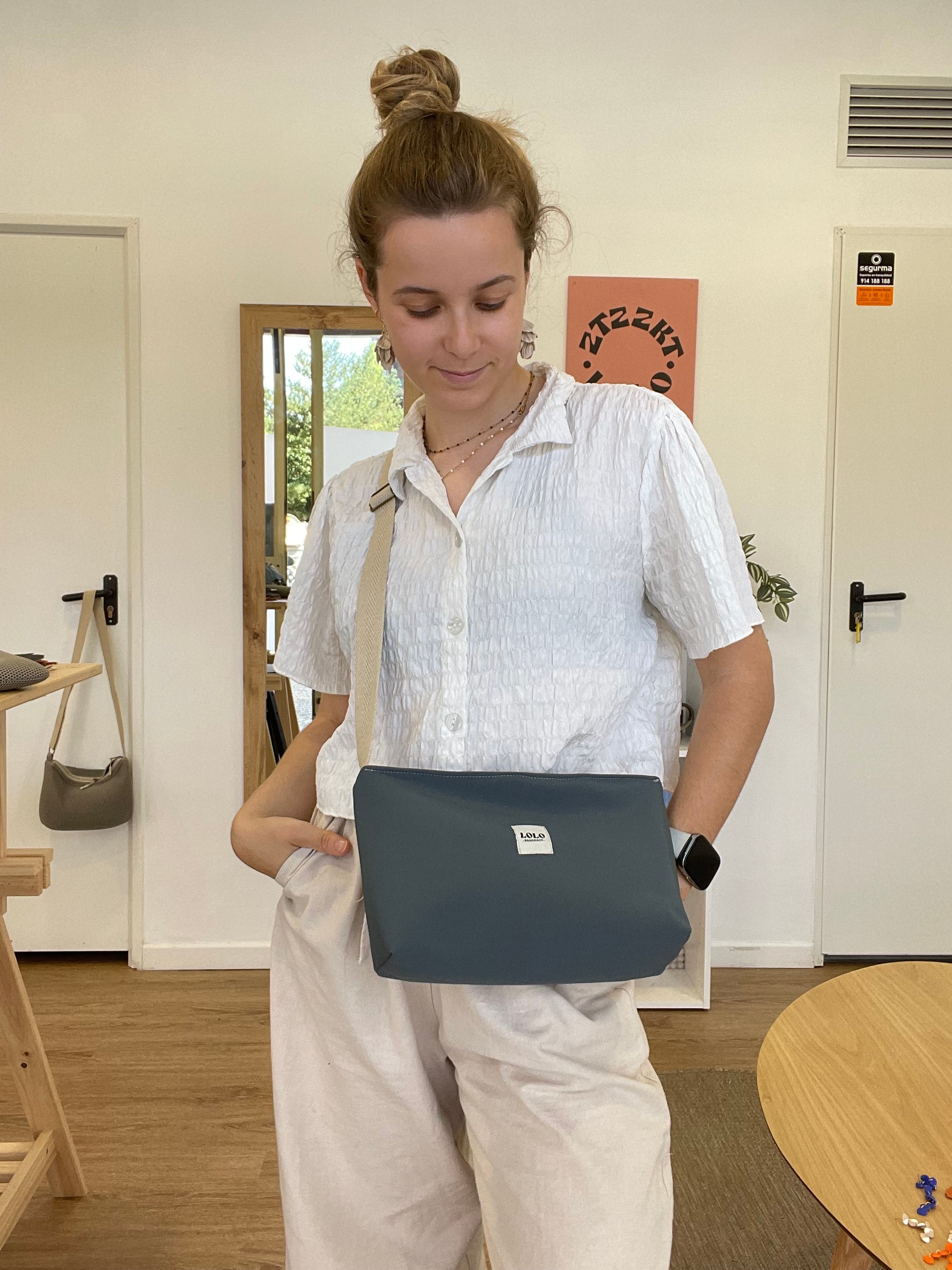 Bolso bandolera en tejido softshell en color azul grisáceo, es un tejido muy resistente al agua.
