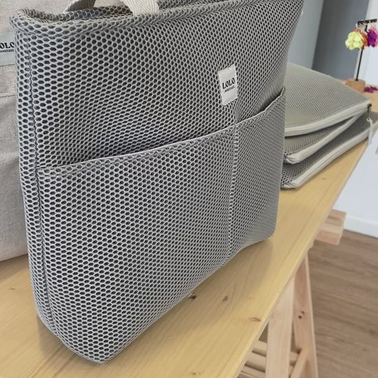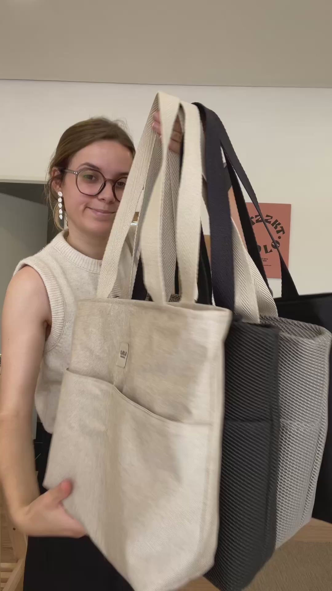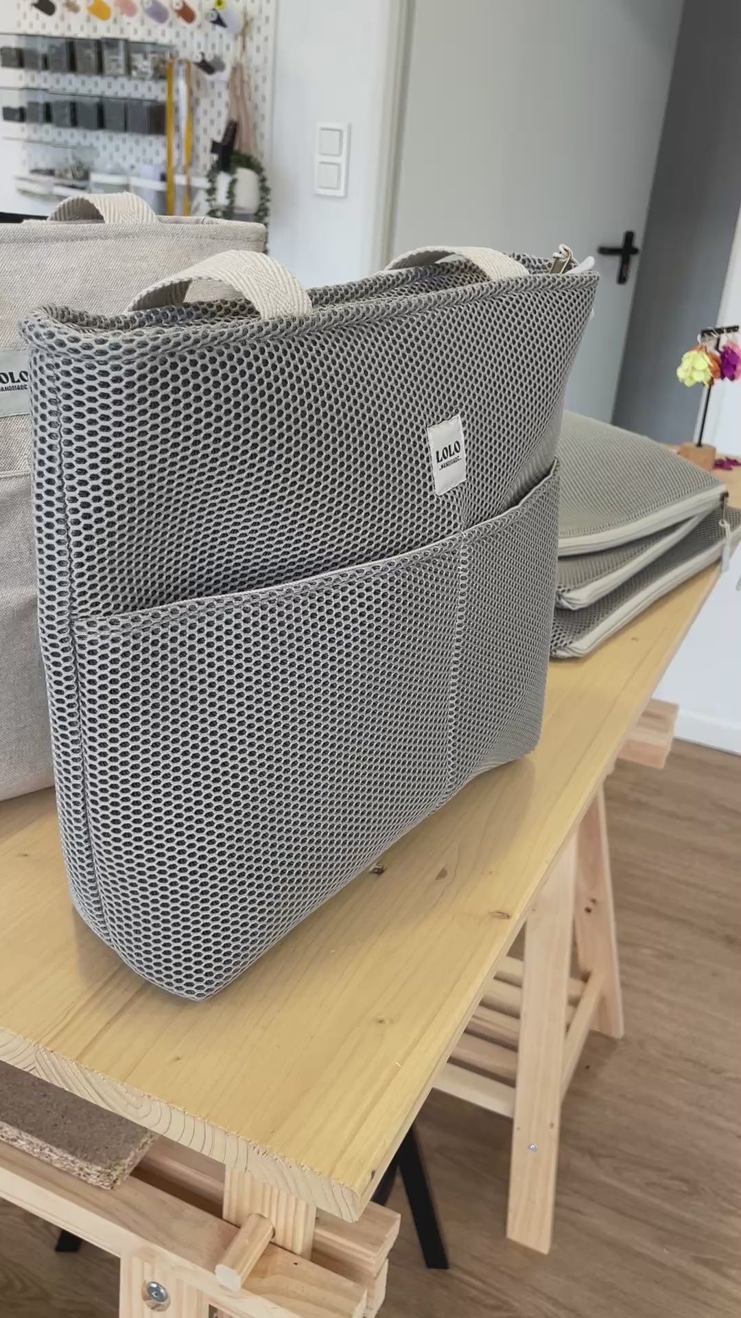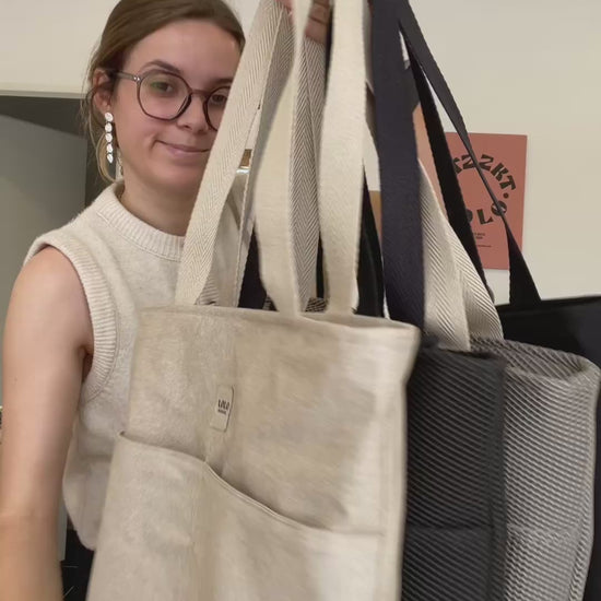 Bolso estilo shopper en loneta resinada/impermeable en color beige, en el exterior del bolso tiene 2 bolsillos con bastante capacidad y en el interior tiene 1 bolsillo doble con cremallera.