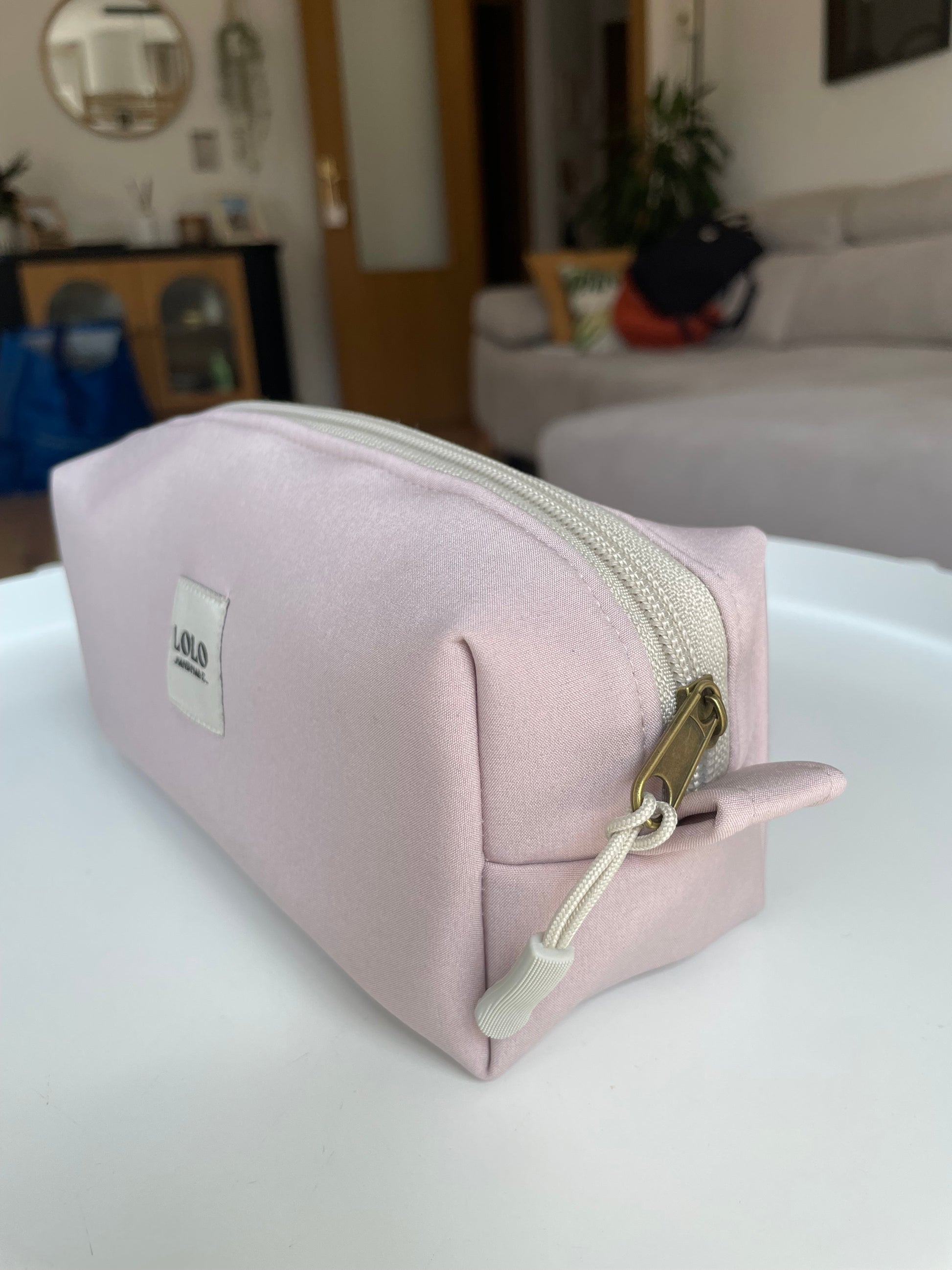 Estuche en color rosa palo, la tela es totalmente impermeable y resistente, también sirve como neceser por su gran capacidad.