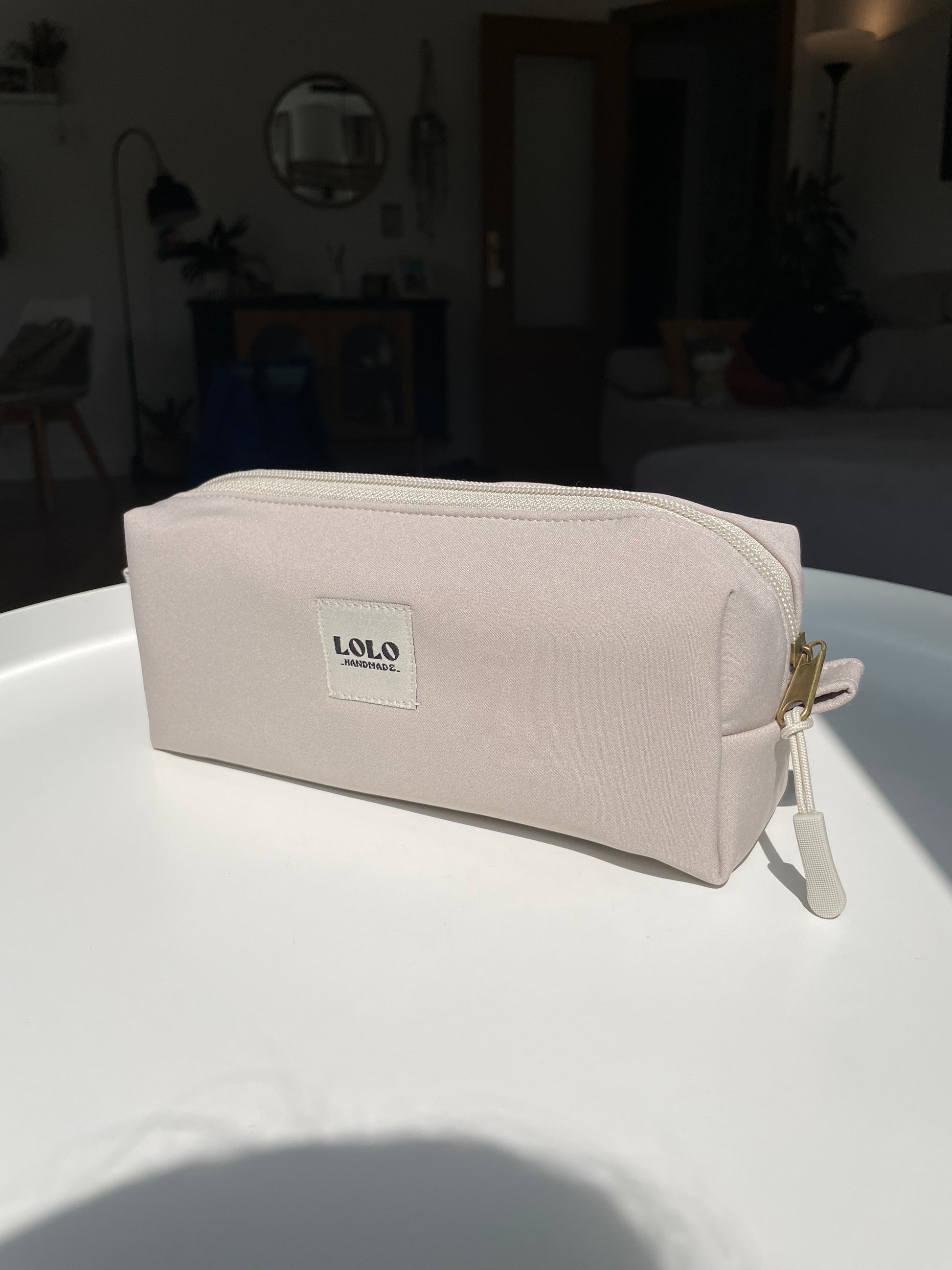 Estuche en color beige, la tela es totalmente impermeable y resistente, también sirve como neceser por su gran capacidad.