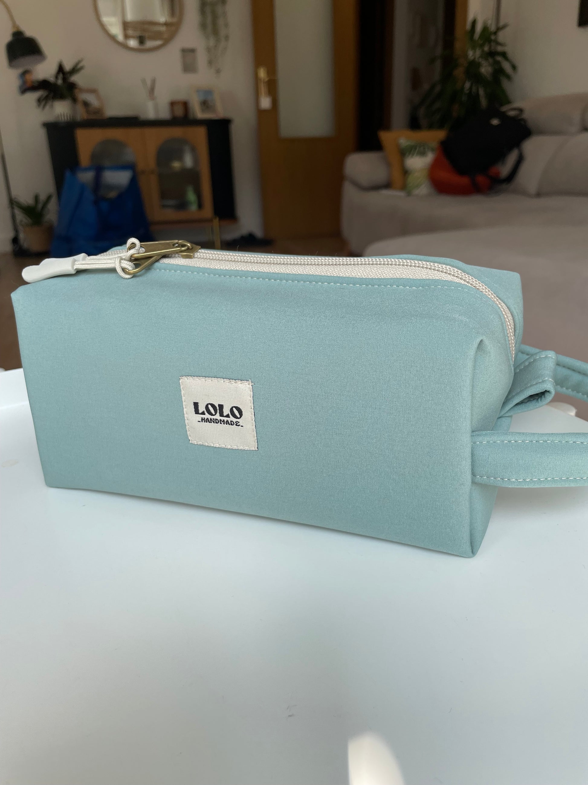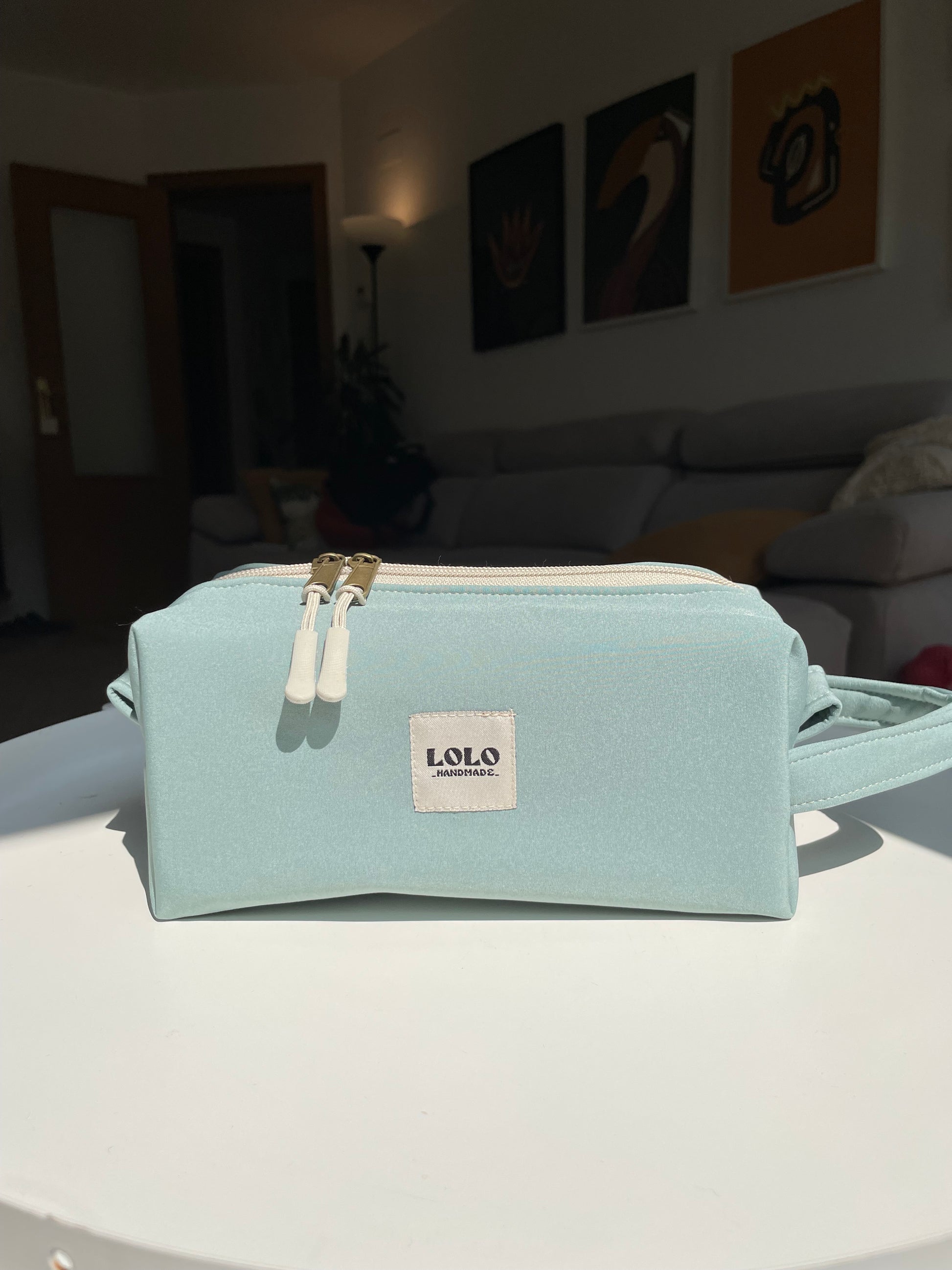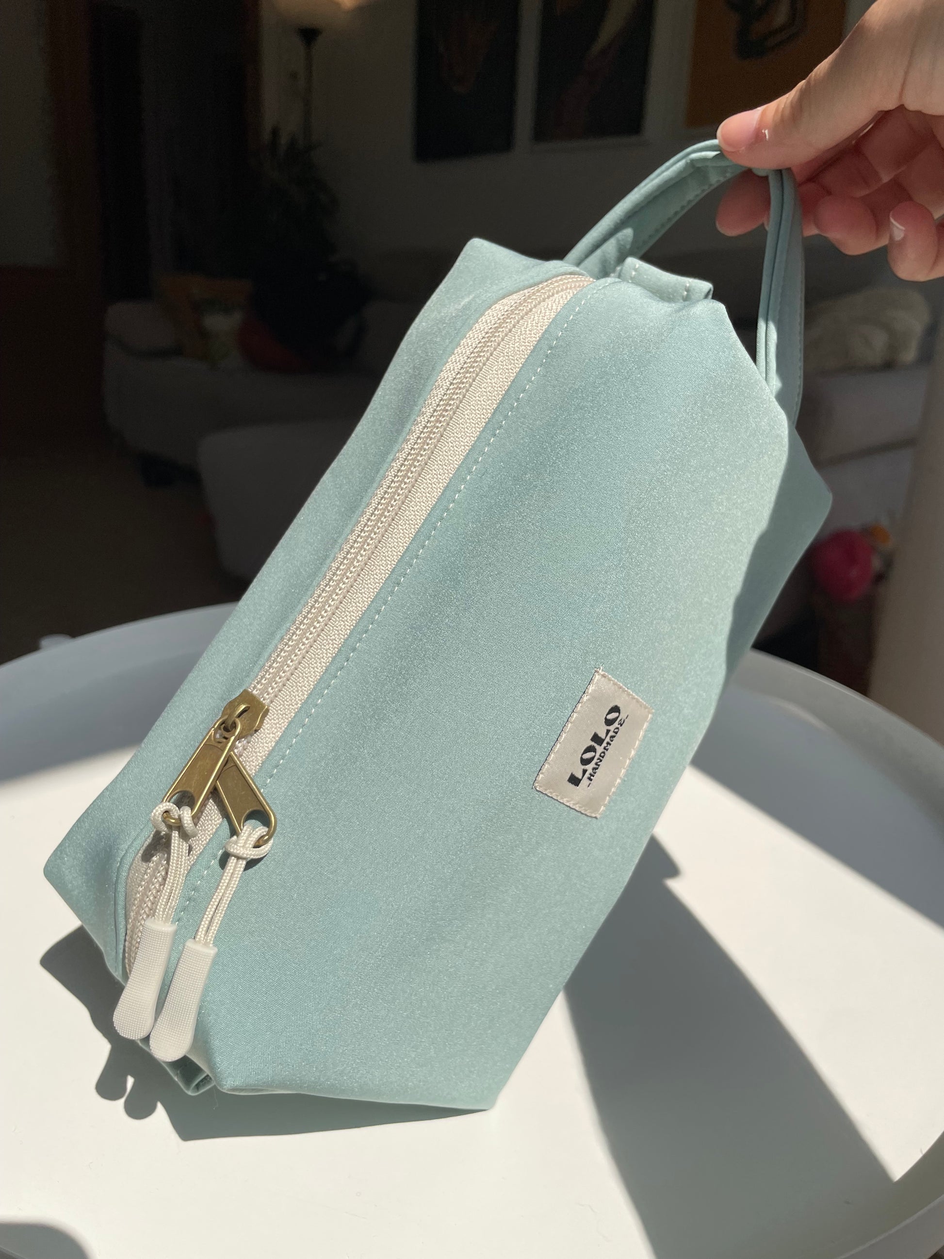 Neceser en color verde menta impermeable, forro resistente al agua. Tiene una tira para poder cogerlo y colgarlo donde quieras.