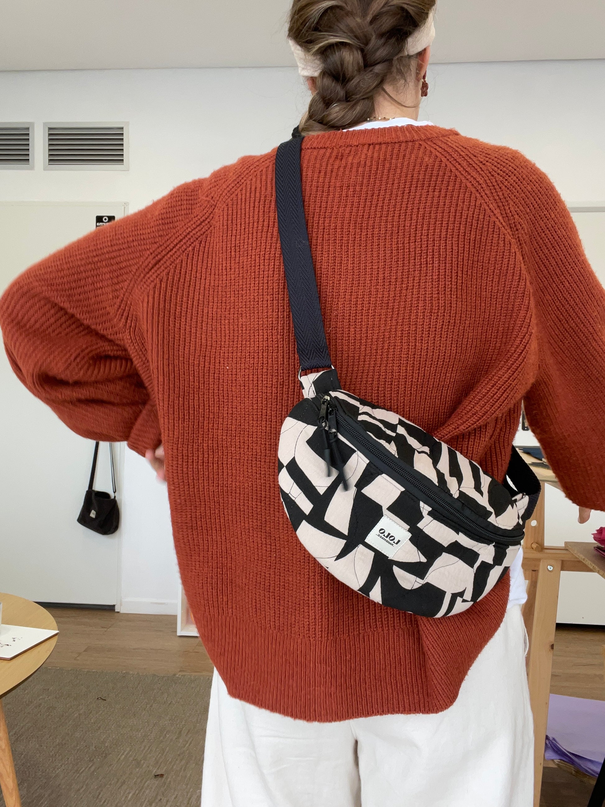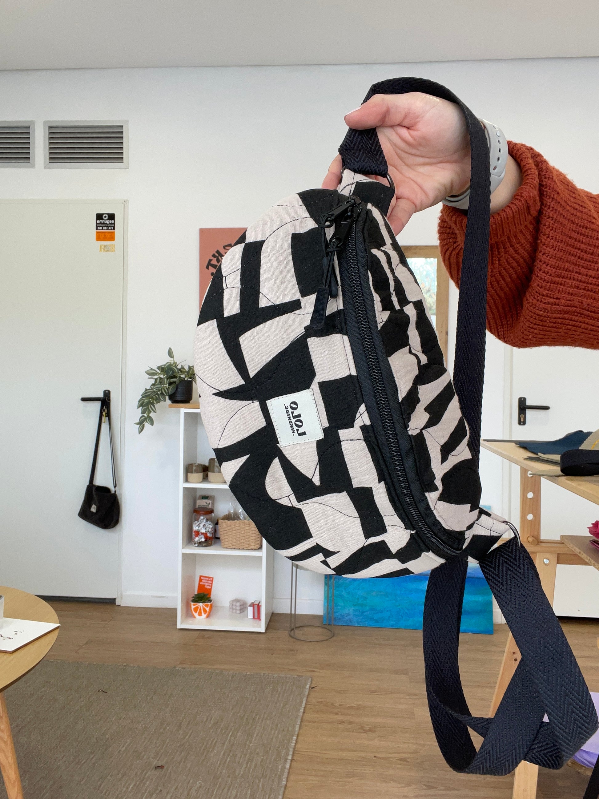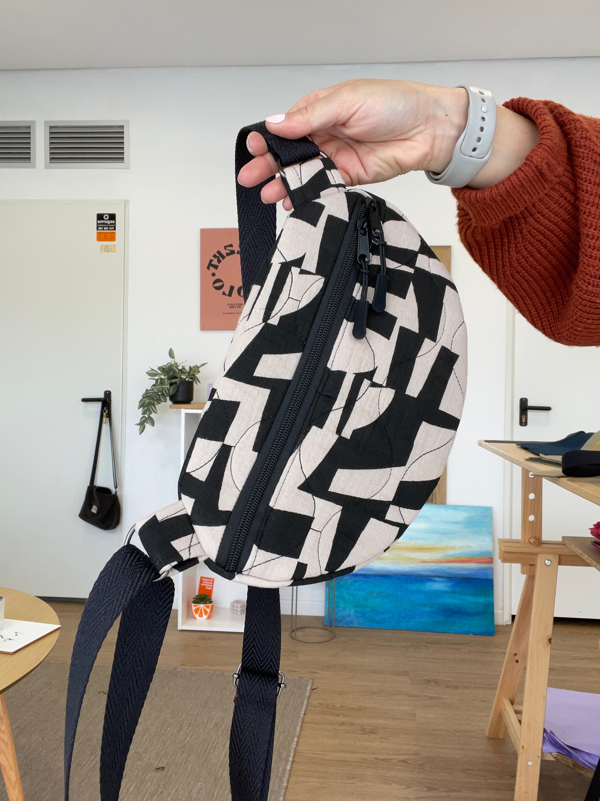 Riñonera en estampado geométrico en tejido de muselina acolchado. Está riñonera es ideal para llevar lo necesario.