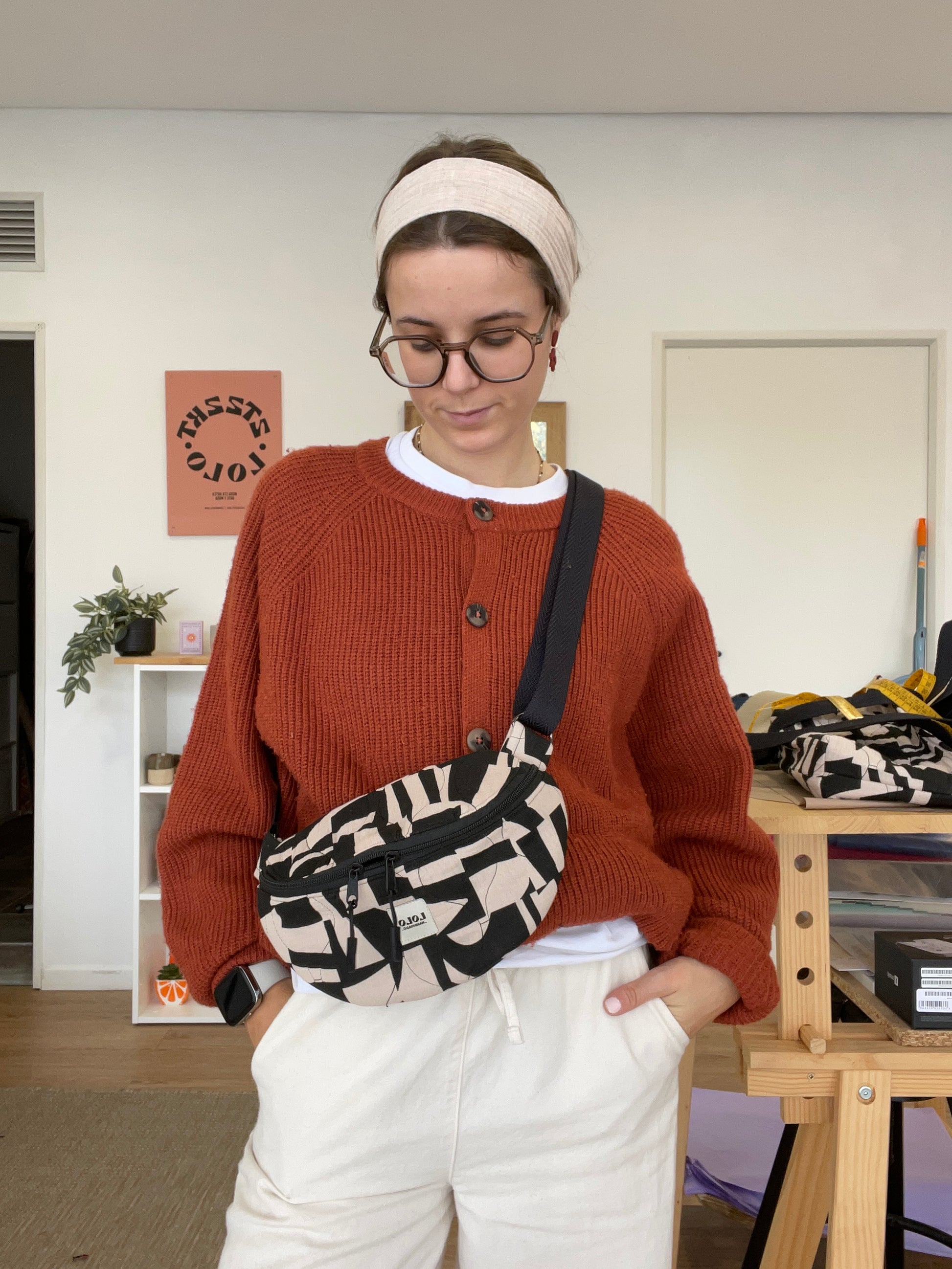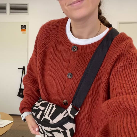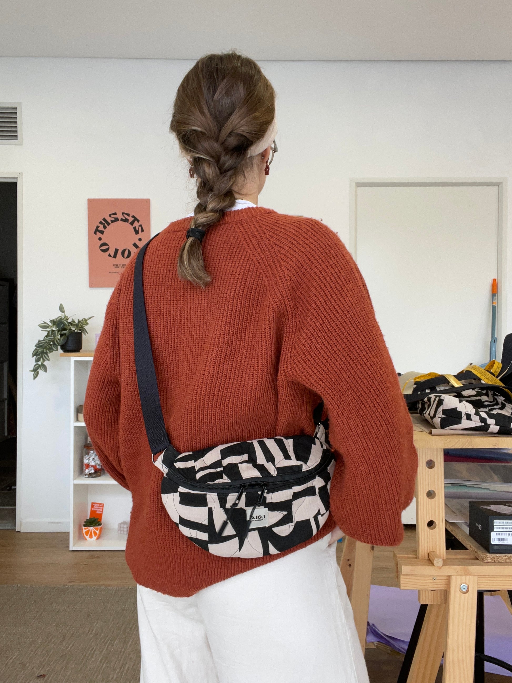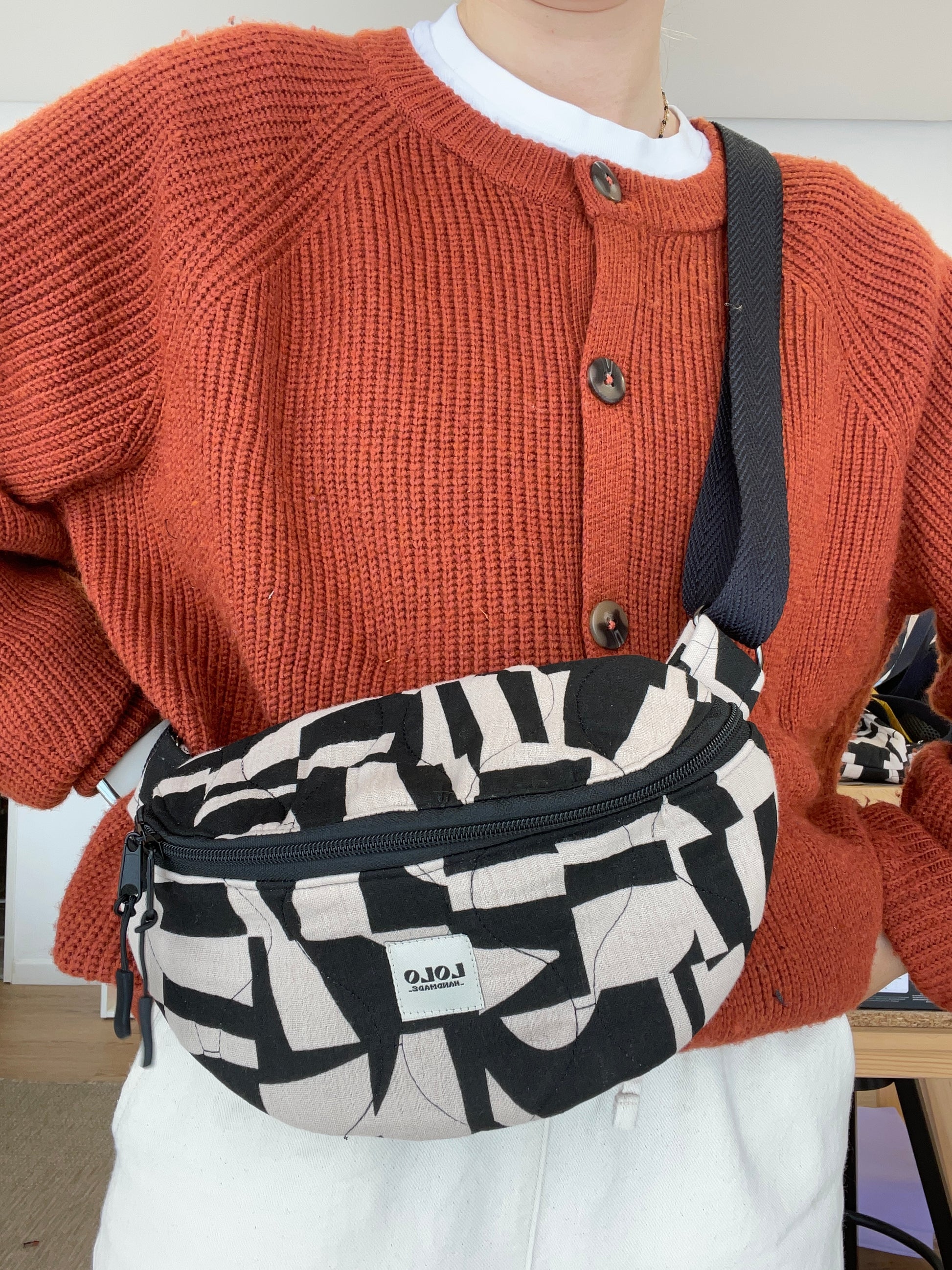 Riñonera en estampado geométrico en tejido de muselina acolchado. Está riñonera es ideal para llevar lo necesario.