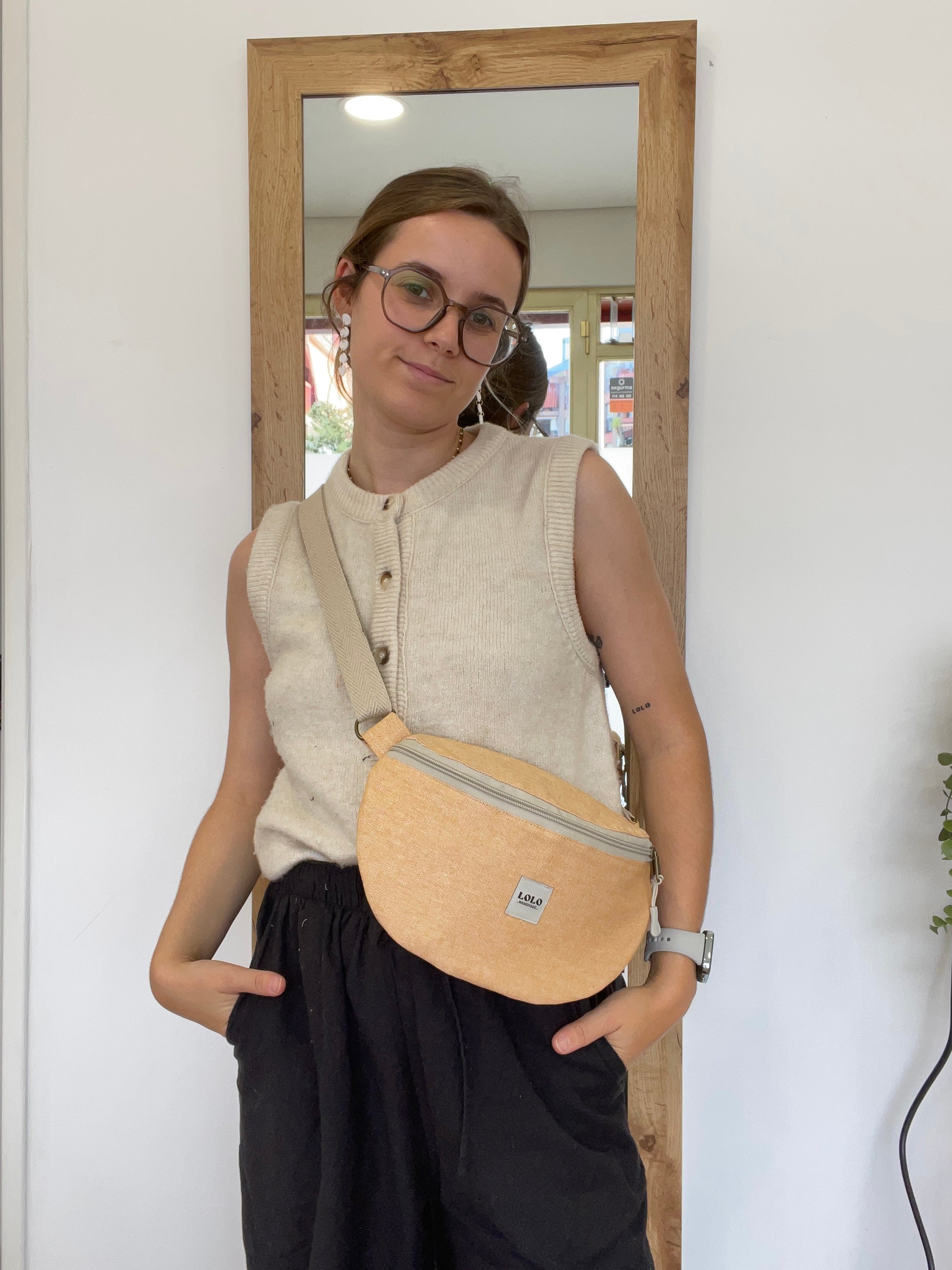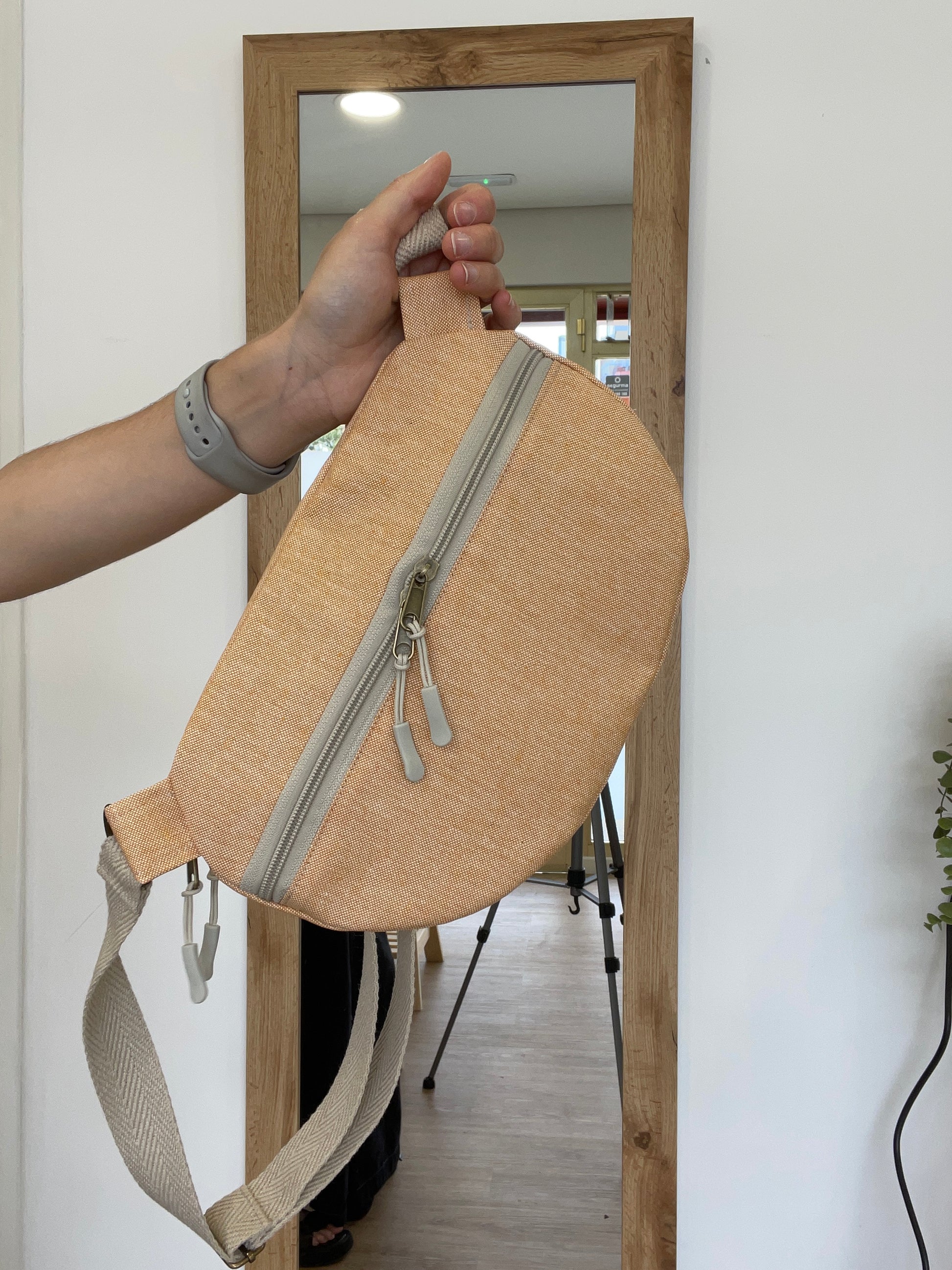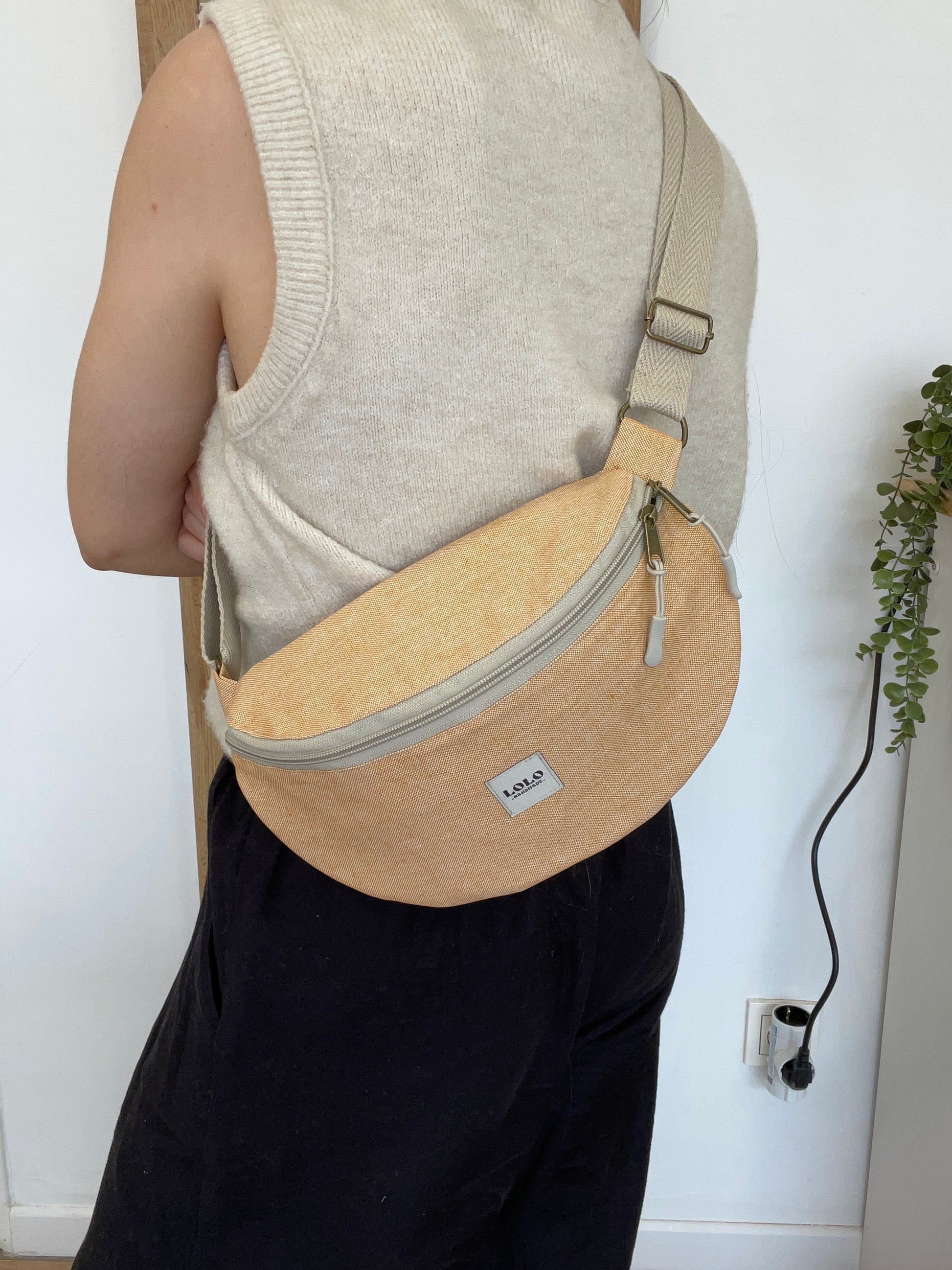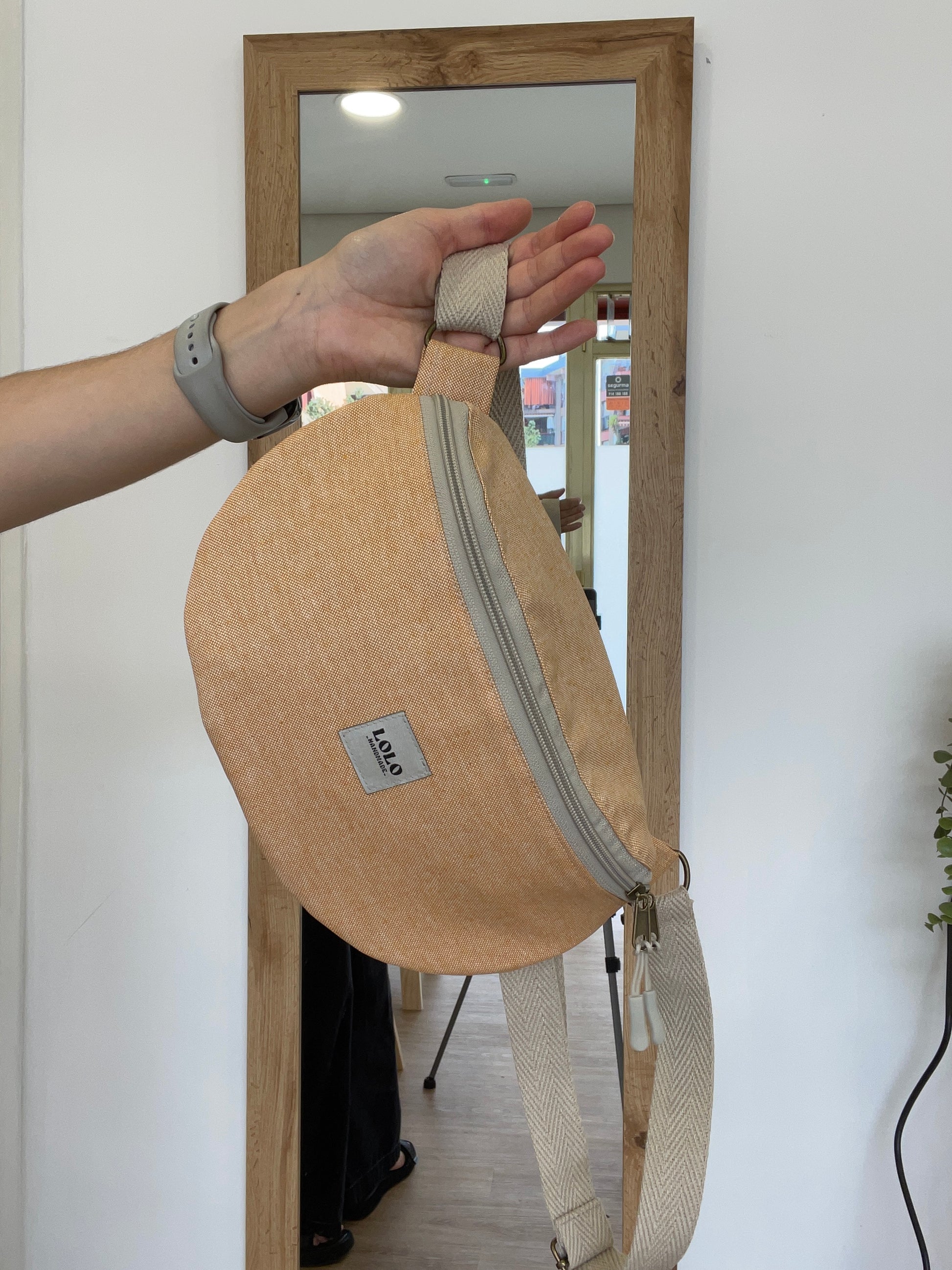 -Riñonera XL en color naranja, la tela es resinada, esto es, impermeable.